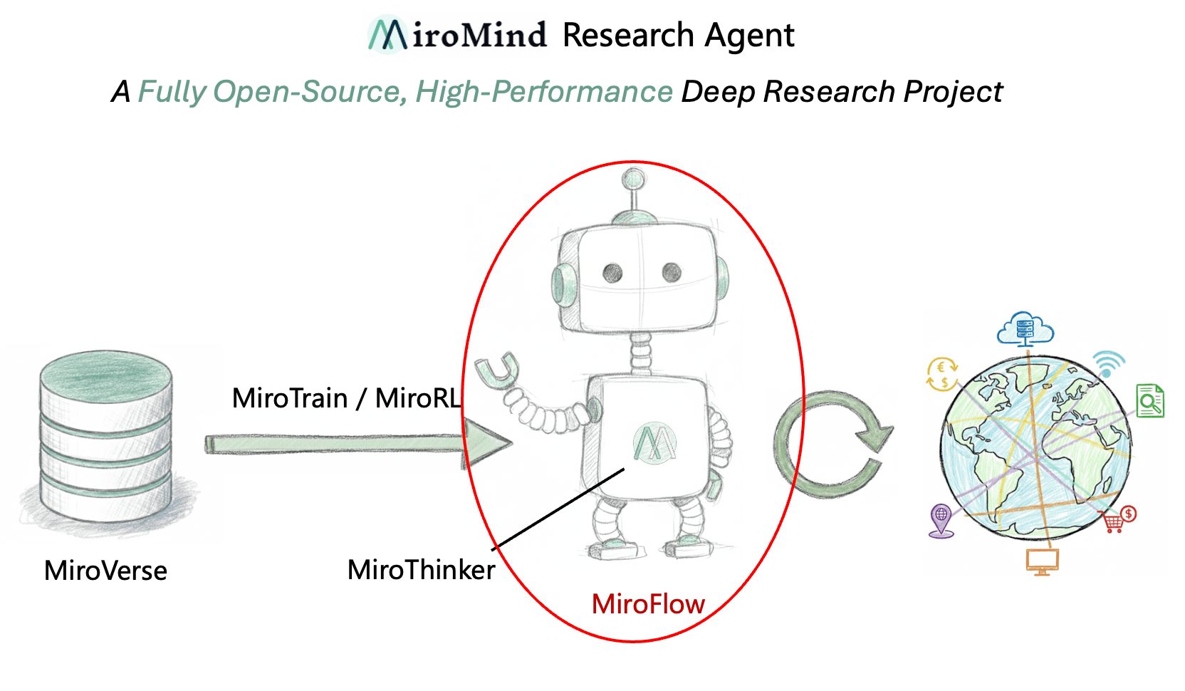 MiroFlow is a powerful open-source research agent framework that can upgrade any LLM to OpenAI Deep Research-level capabilities. It is a key component of the MiroMind Research Agent Project, and is designed to reliably complete complex tool-use tasks.